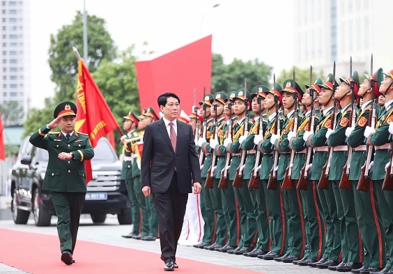 Chủ tịch nước Lương Cường duyệt Đội danh dự tại buổi lễ.