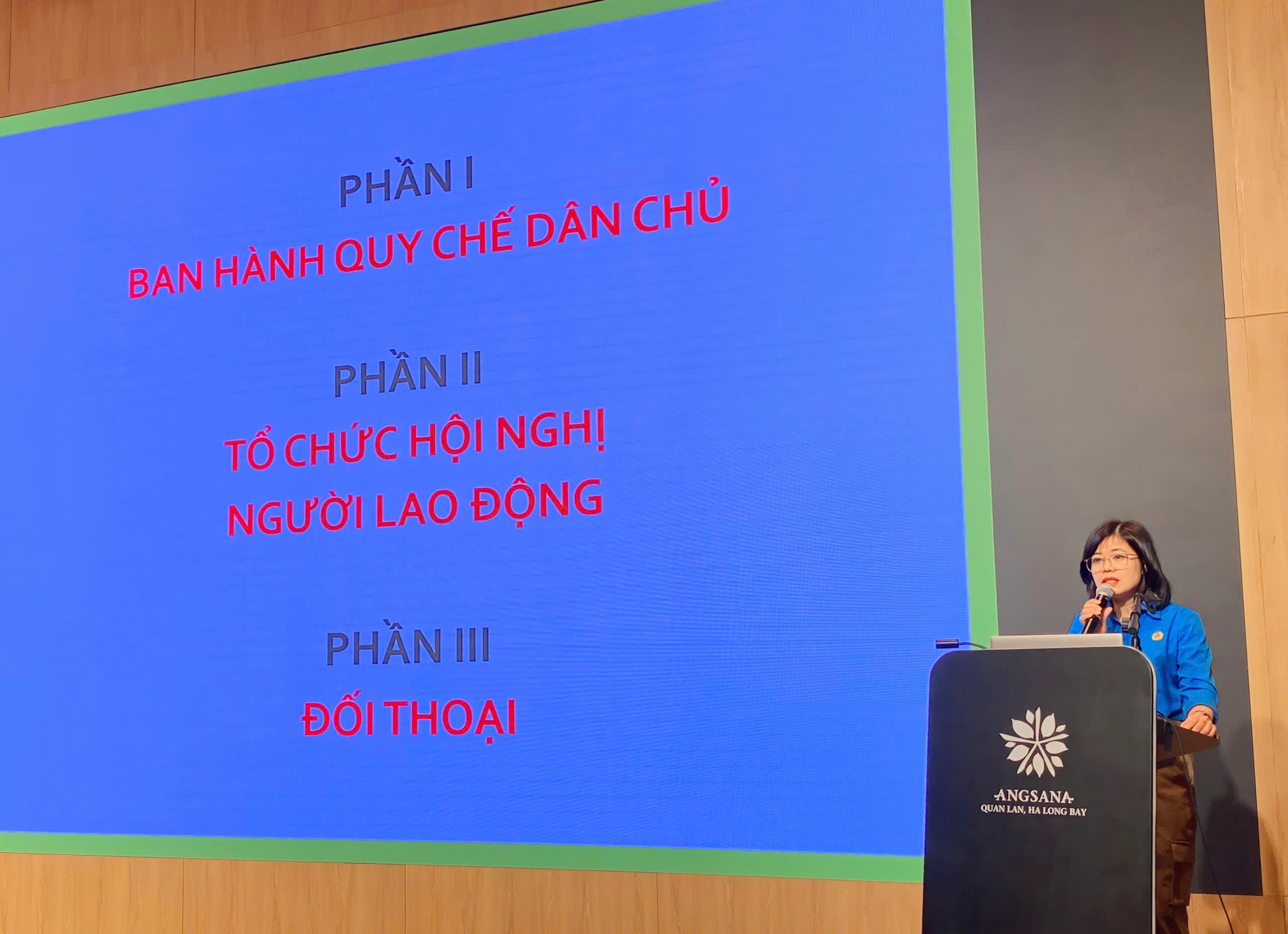 Đồng chí Trần Thị Thu Phương – Ủy viên Ban chấp hành CĐXDVN, Phó Ban Chính sách Pháp luật và Quan hệ lao động truyền đạt nội dung Công đoàn tham gia thực hiện Luật dân chủ ở cơ sở; Thỏa ước lao động tập thể tại doanh nghiệp.
